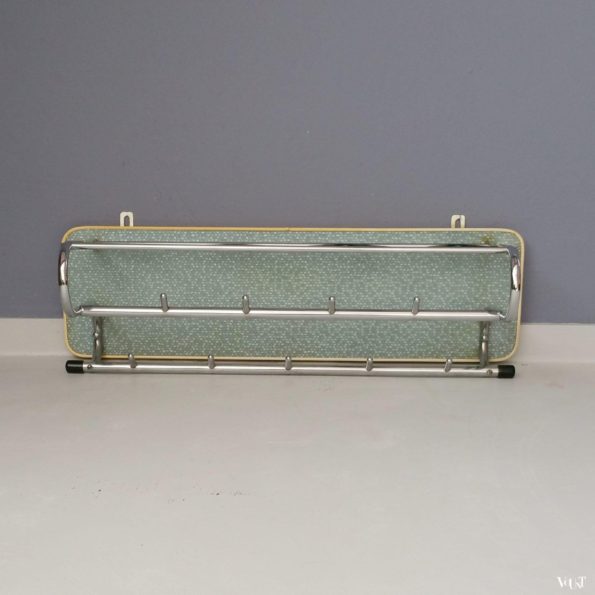Wandkapstok uit de jaren ’50 in bijzonder goede conditie. Verchroomd metaal, hout en een mooie groen-blauwige kunststof achtergrond. Zwart metalen hoedenrek.