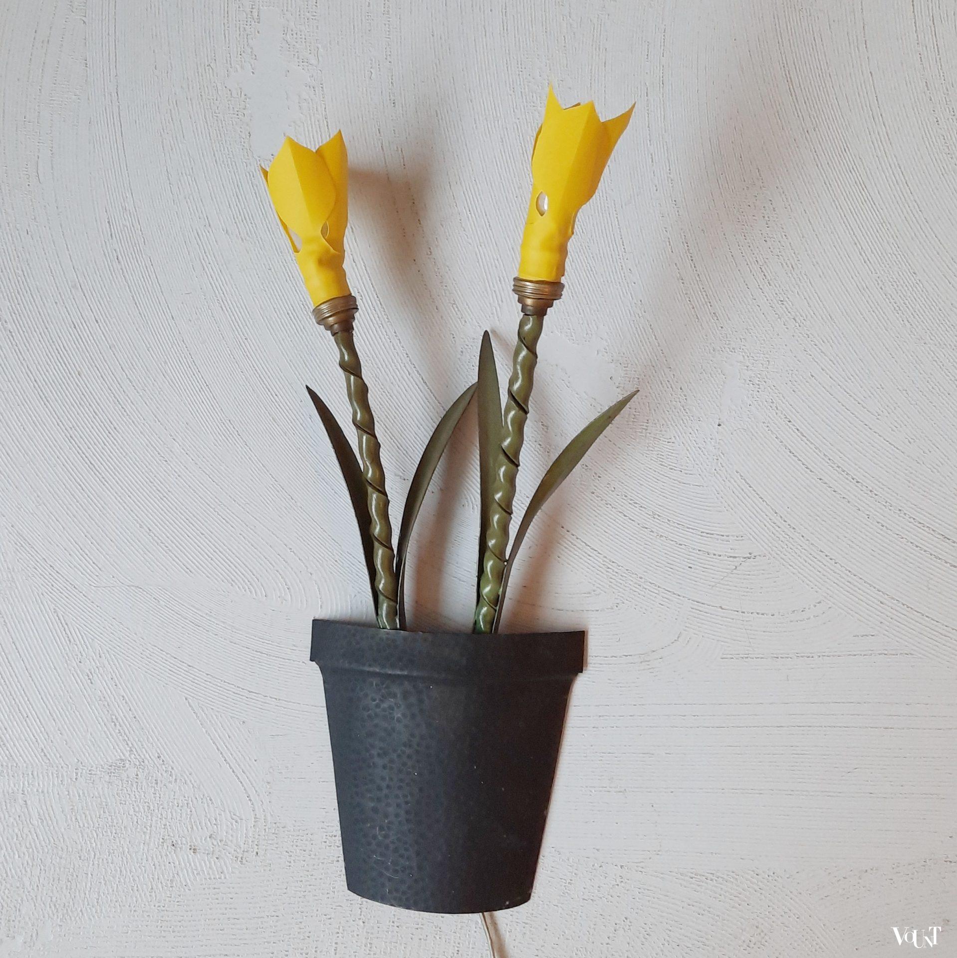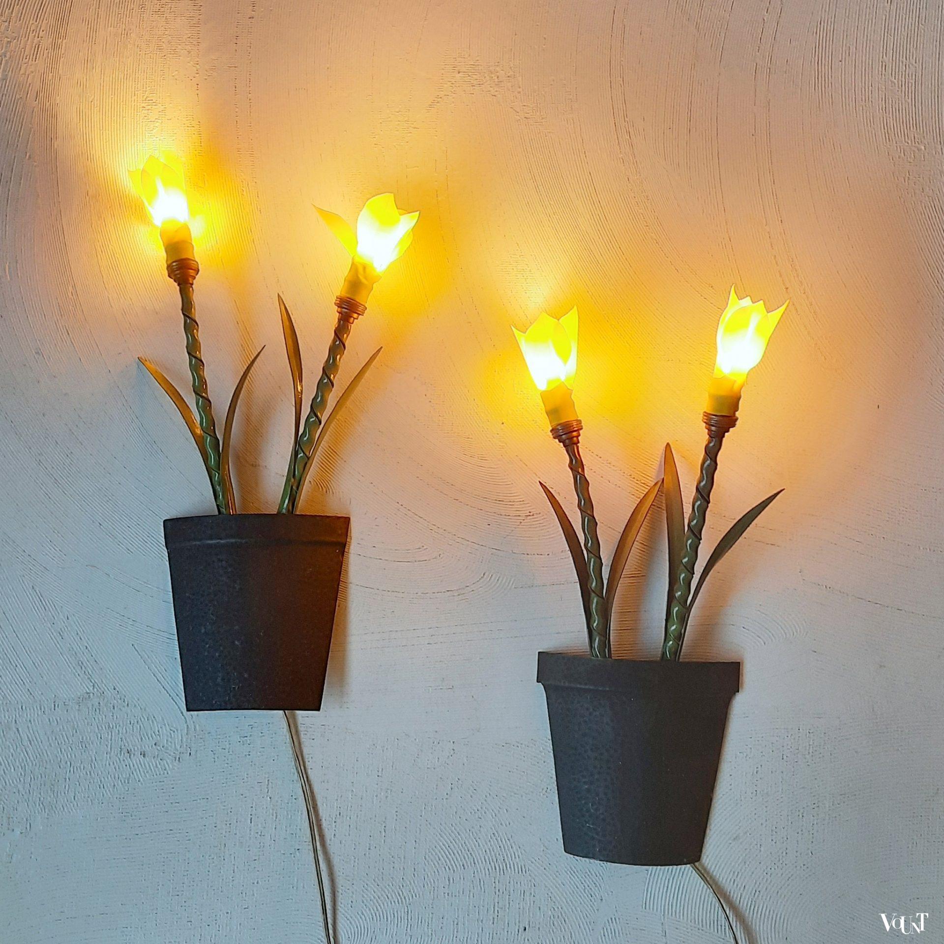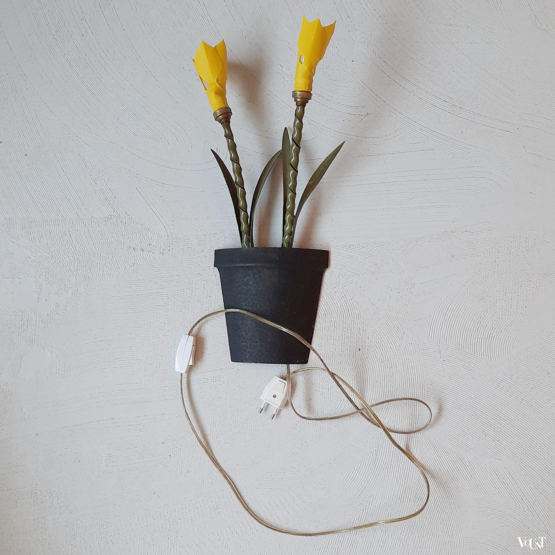 Deze bijzondere wandverlichting in de vorm van (halve) metalen plantenpotten met bloemen komt uit Frankrijk. Waarschijnlijk hoorden hier oorspronkelijk bloemenlampjes of kapjes in de vorm van een bloem bij. Hiervoor in de plaats zijn gele kunststof (rubberen) bloemen/narcissen aan de metalen steel toegevoegd. Beide lampen zijn opnieuw bedraad en van snoerschakelaars voorzien. Met wandophanging.
