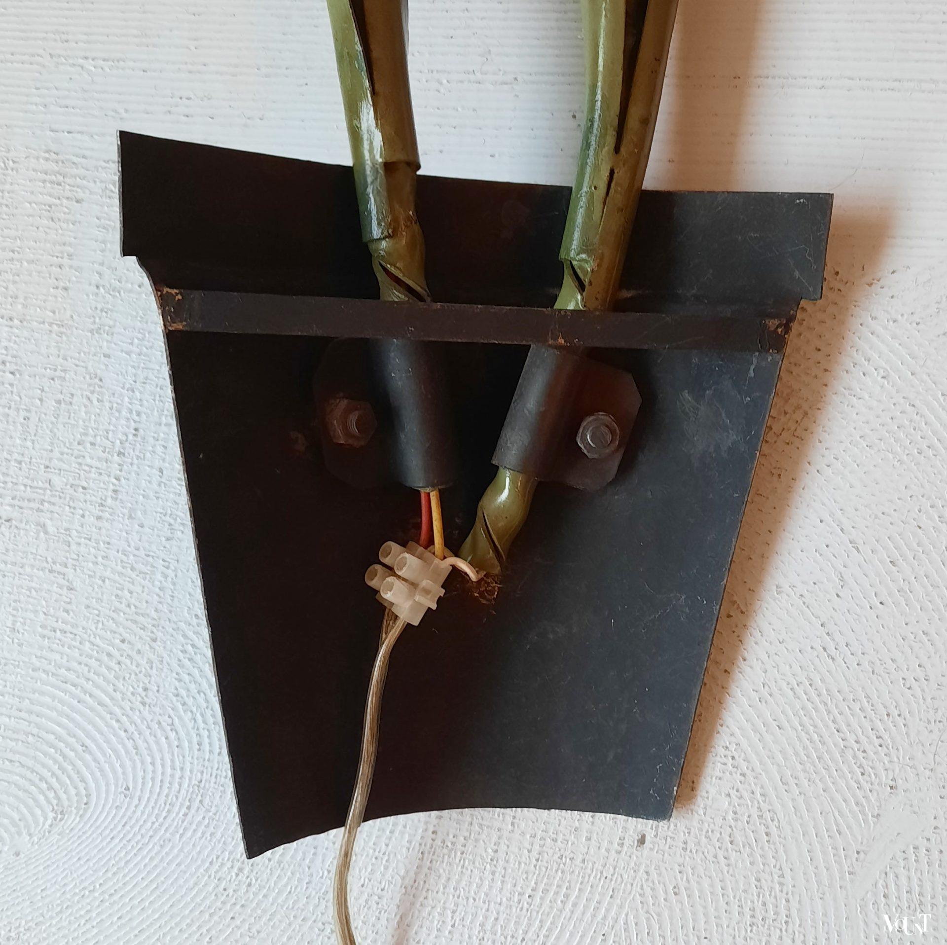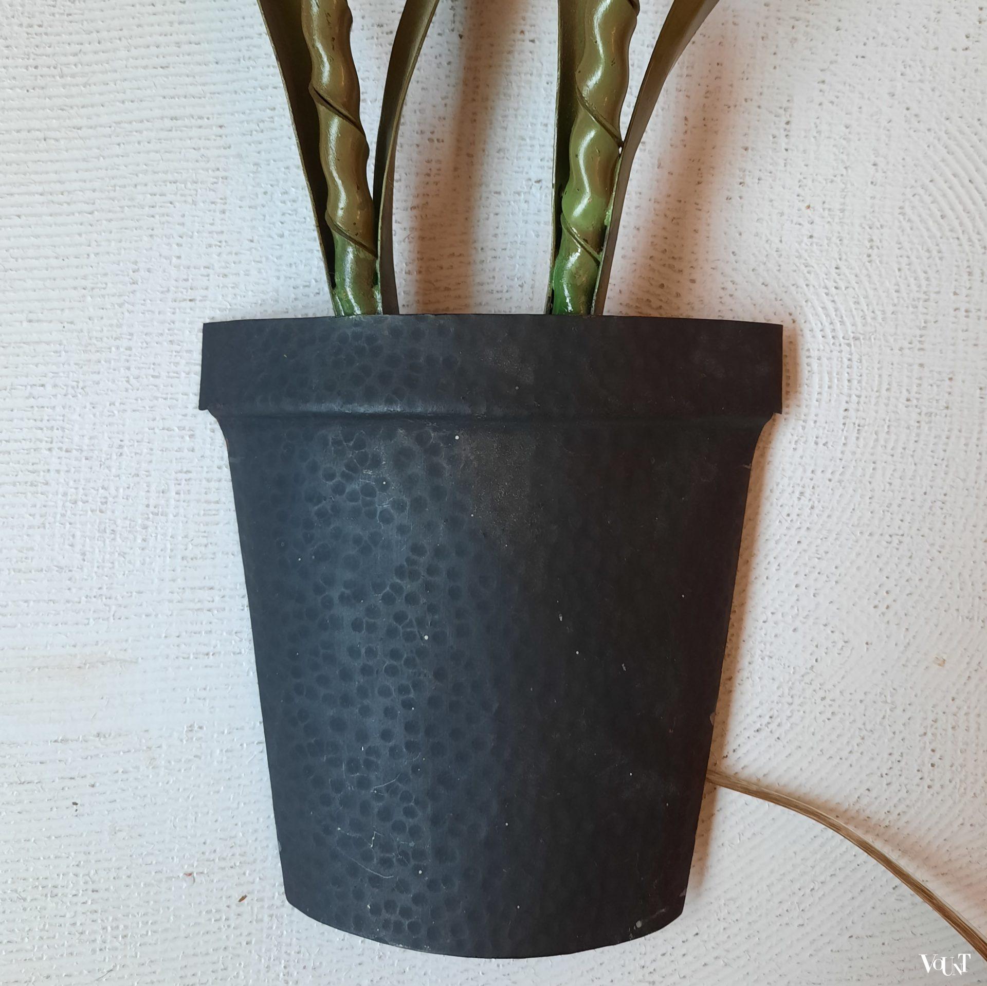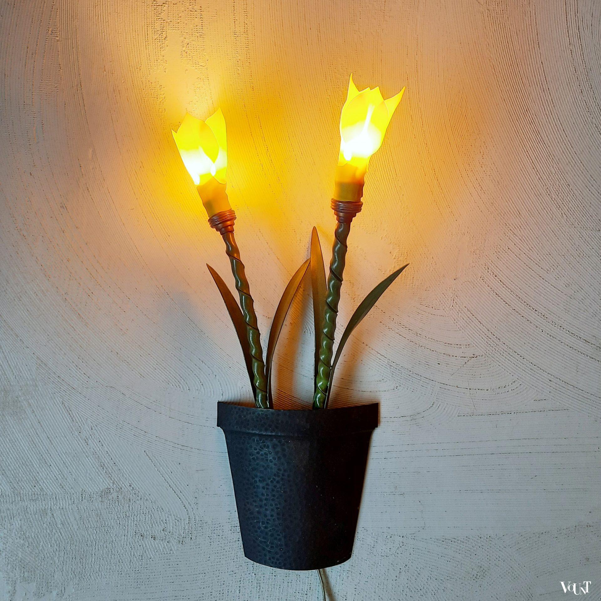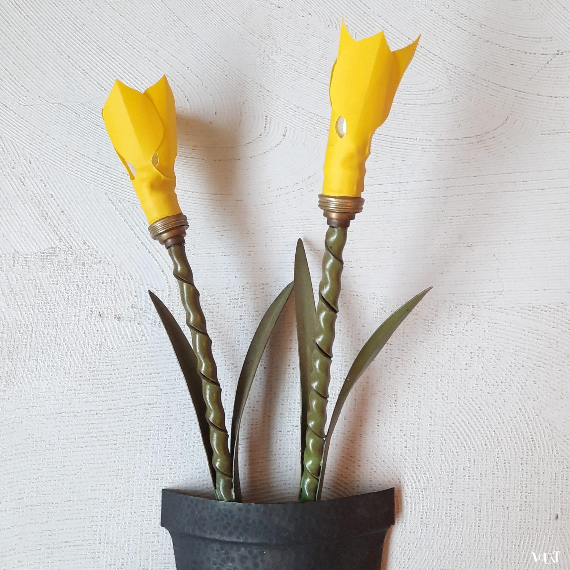 Deze bijzondere wandverlichting in de vorm van (halve) metalen plantenpotten met bloemen komt uit Frankrijk. Waarschijnlijk hoorden hier oorspronkelijk bloemenlampjes of kapjes in de vorm van een bloem bij. Hiervoor in de plaats zijn gele kunststof (rubberen) bloemen/narcissen aan de metalen steel toegevoegd. Beide lampen zijn opnieuw bedraad en van snoerschakelaars voorzien. Met wandophanging.