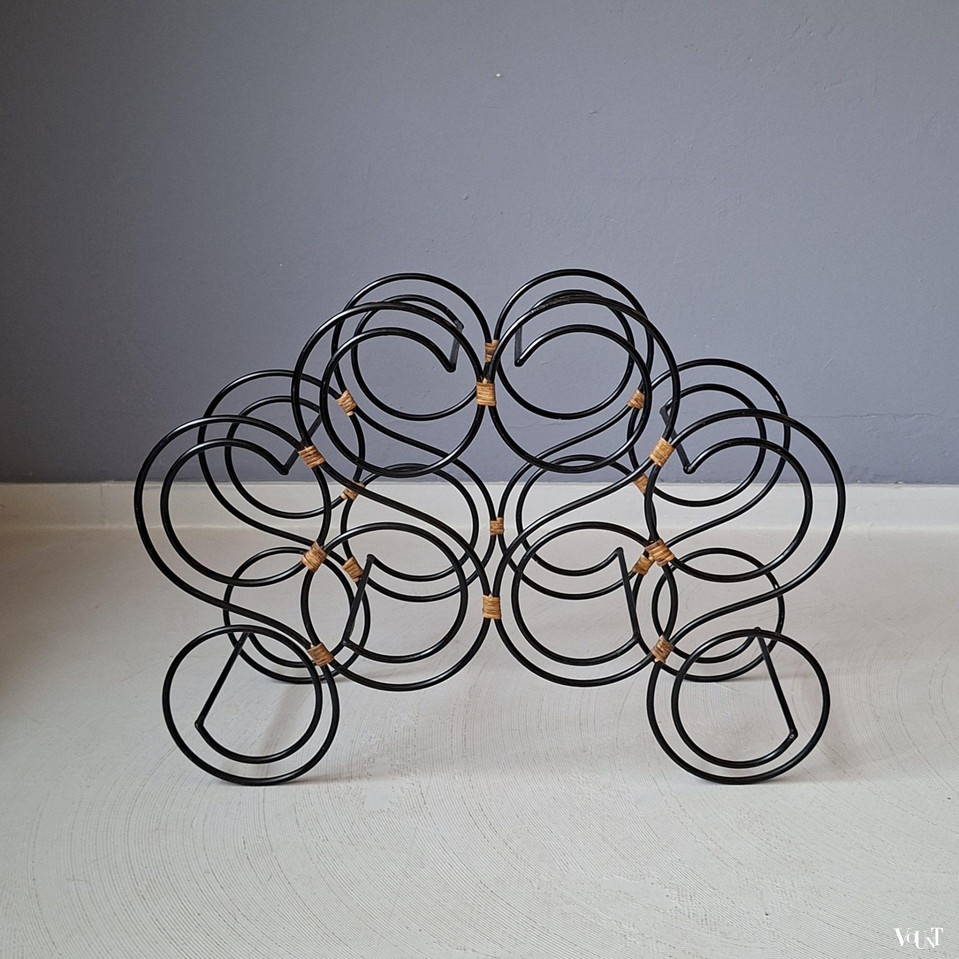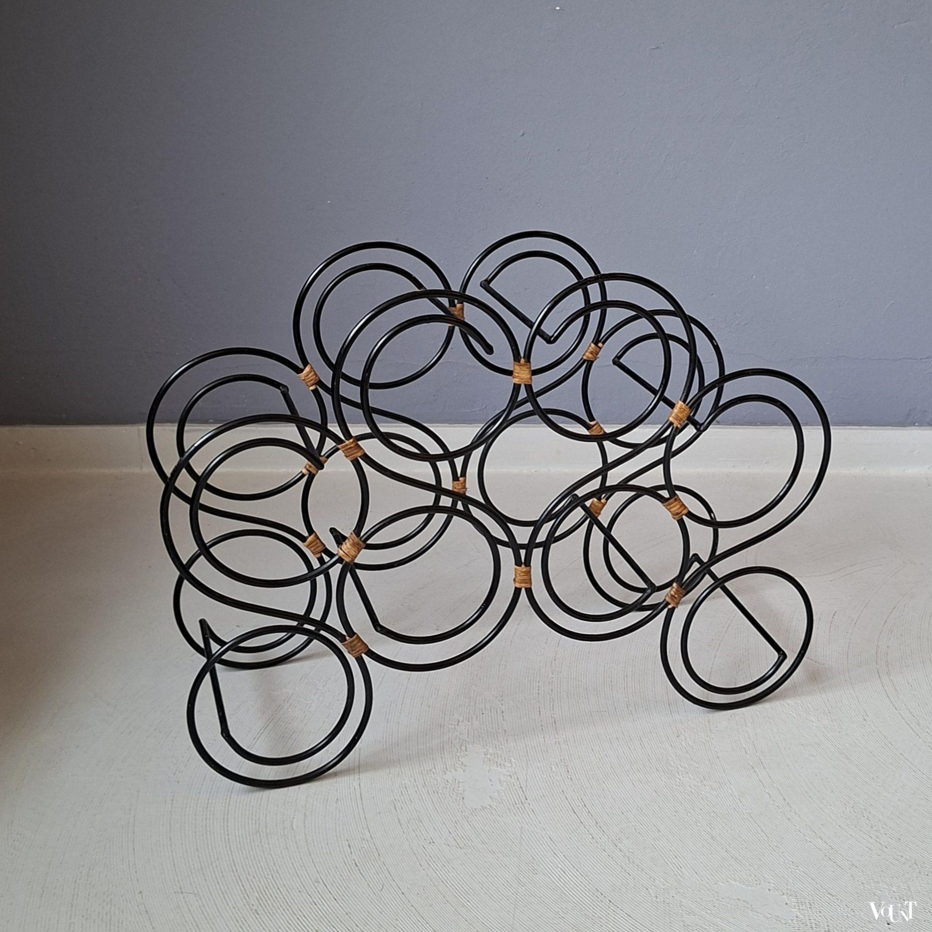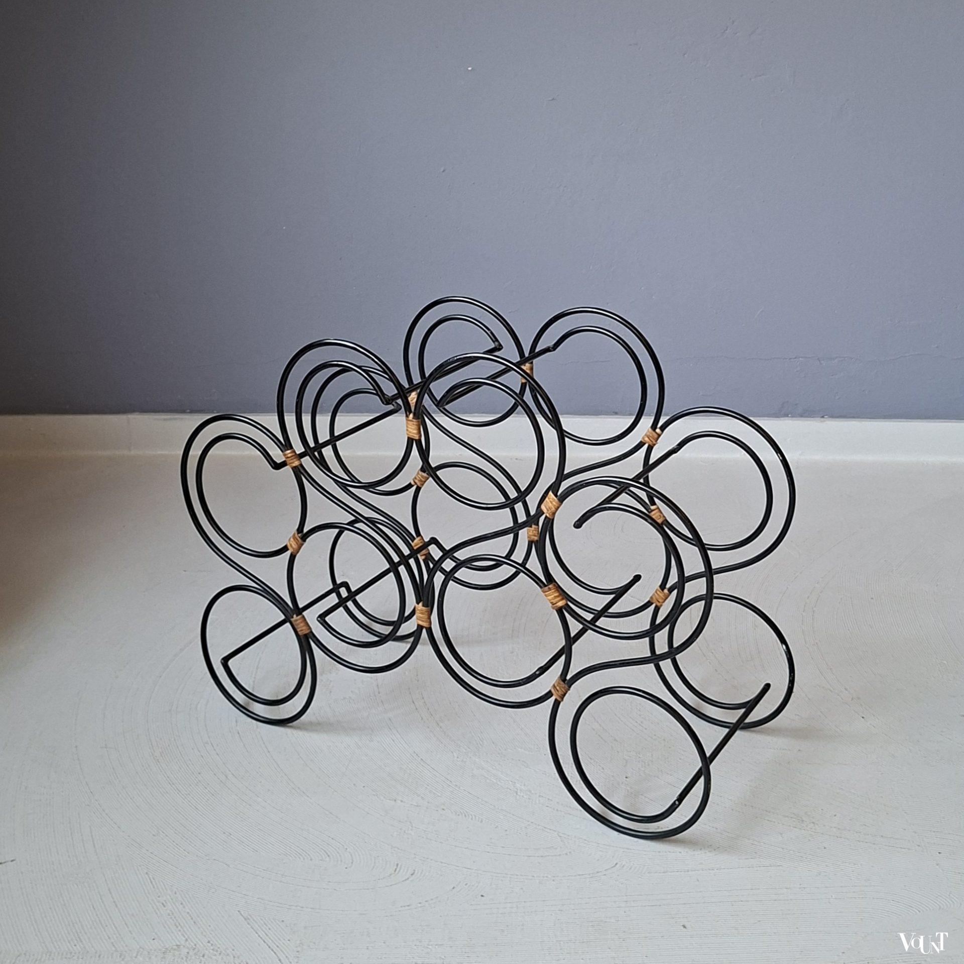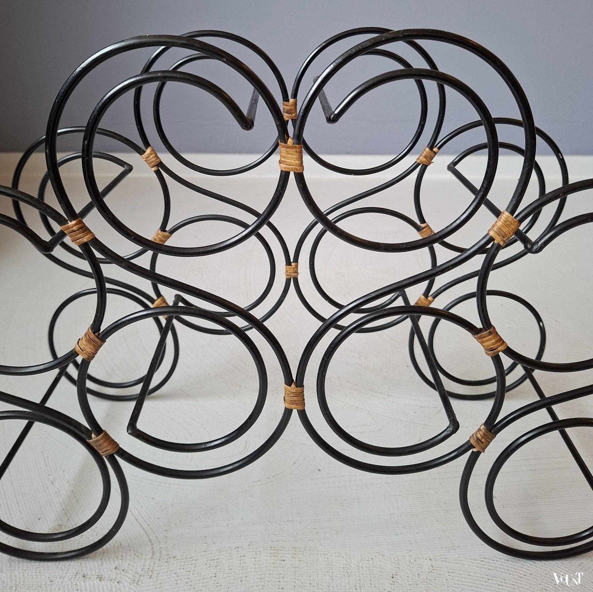 Ruimtelijk vormgegeven zwart stafstalen wijnrek. Voorzien van rotan elementen. Biedt plaats aan 8 flessen. In goede conditie.