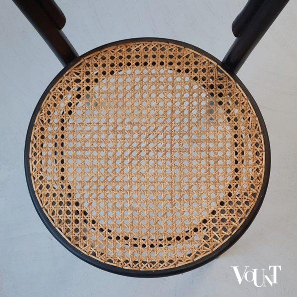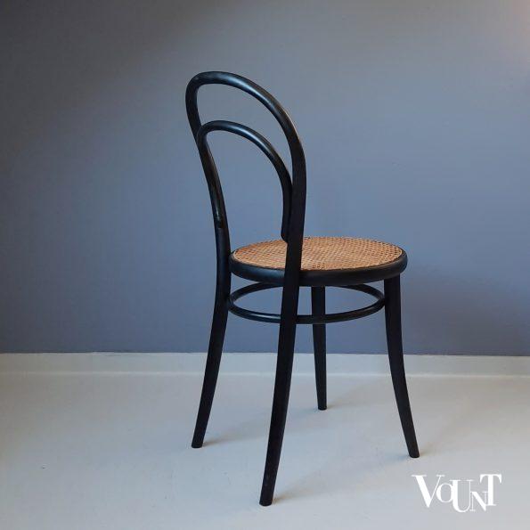Deze zwarte nr. 14 stoel dateert uit de jaren ’60 en is geproduceerd door Ligna, een (na WO II onteigende) Thonet-fabriek in voormalig Tsjechoslowakije. Hout en rotan in goede conditie. Voor de leeftijd normale ouderdoms- en gebruikssporen. Zowel voorzien van Ligna-stempel in het hout als van papieren Ligna-label.