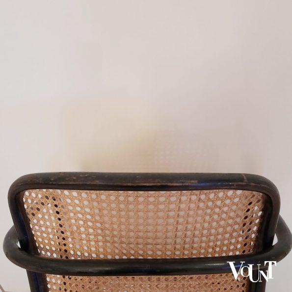 De Praag of 811 stoel werd in de jaren ’20 van de vorige eeuw door de Oostenrijkse architect/ontwerper Josef Hoffmann voor Thonet ontworpen en werd een groot succes. Deze was zowel in de jaren ’30 als in de jaren ’50/’60 populair (onder anderen onder architecten). Ook nu is deze stoel weer erg gewild. Volgens informatie van Thonet is de 811 stoel door Thonet alleen in de jaren ’30 en ’50 van de vorige eeuw geproduceerd. Deze stoel die voorzien is van een Thonet-label is in goede vintage-conditie en heeft een nieuwe (januari 2021) met de hand geweven rotan zitting. Sporen van slijtage van de zwarte verf op het hout. Bijzonder is dat deze stoel onder de zitting ook een Ligna label heeft: een stoel uit de periode kort nadat de Thonet-fabriek in het toenmalige Tsjecho-Slowakije genationaliseerd werd.
