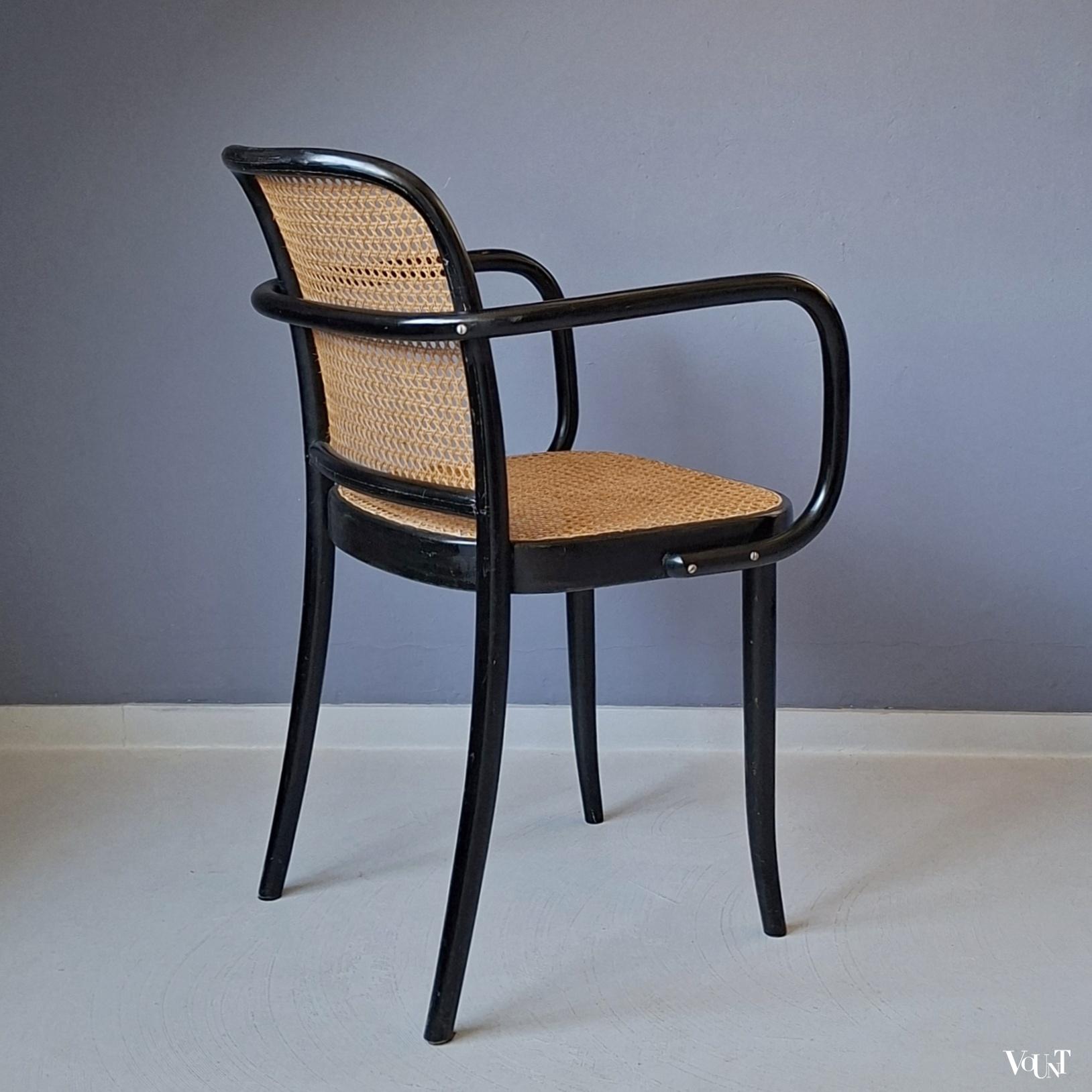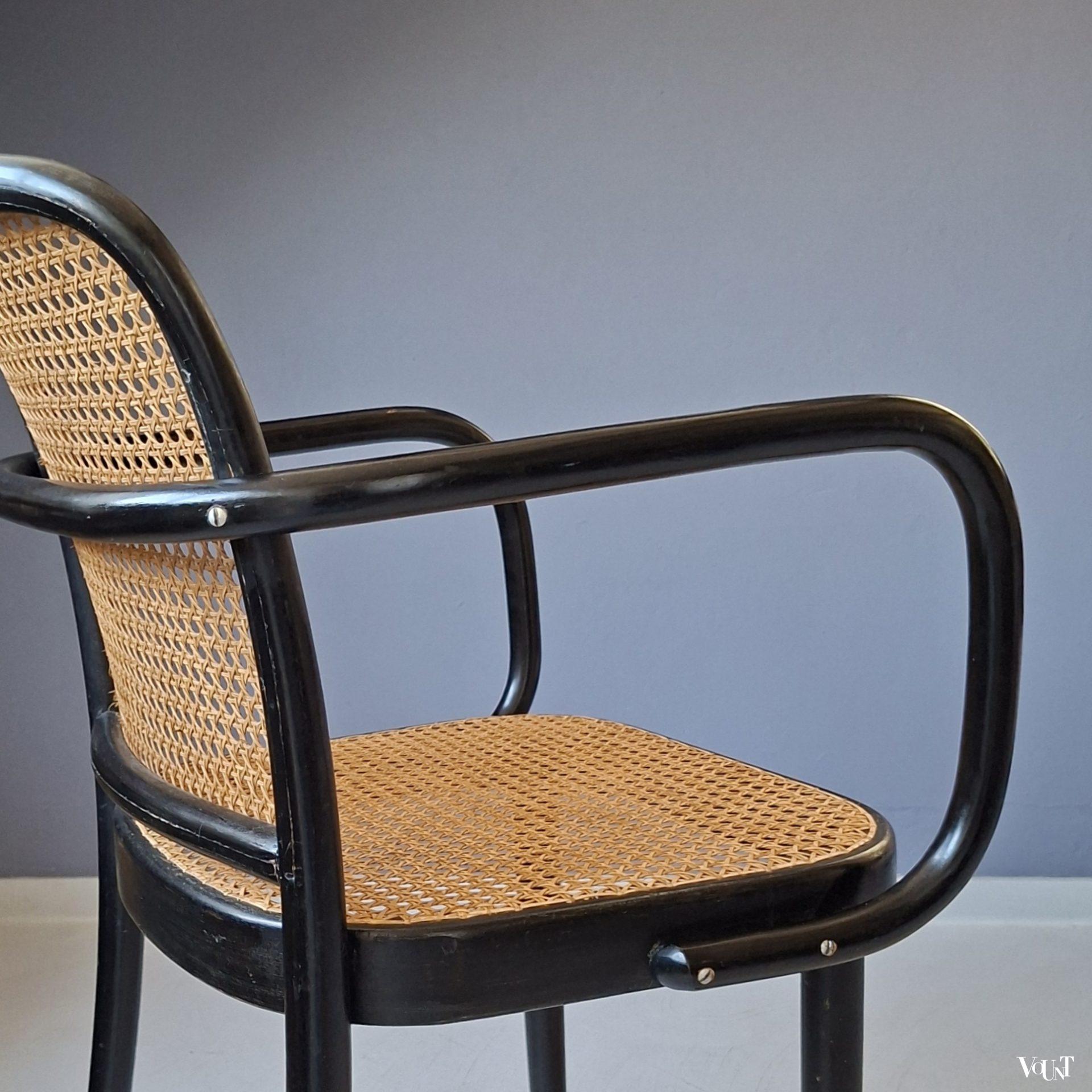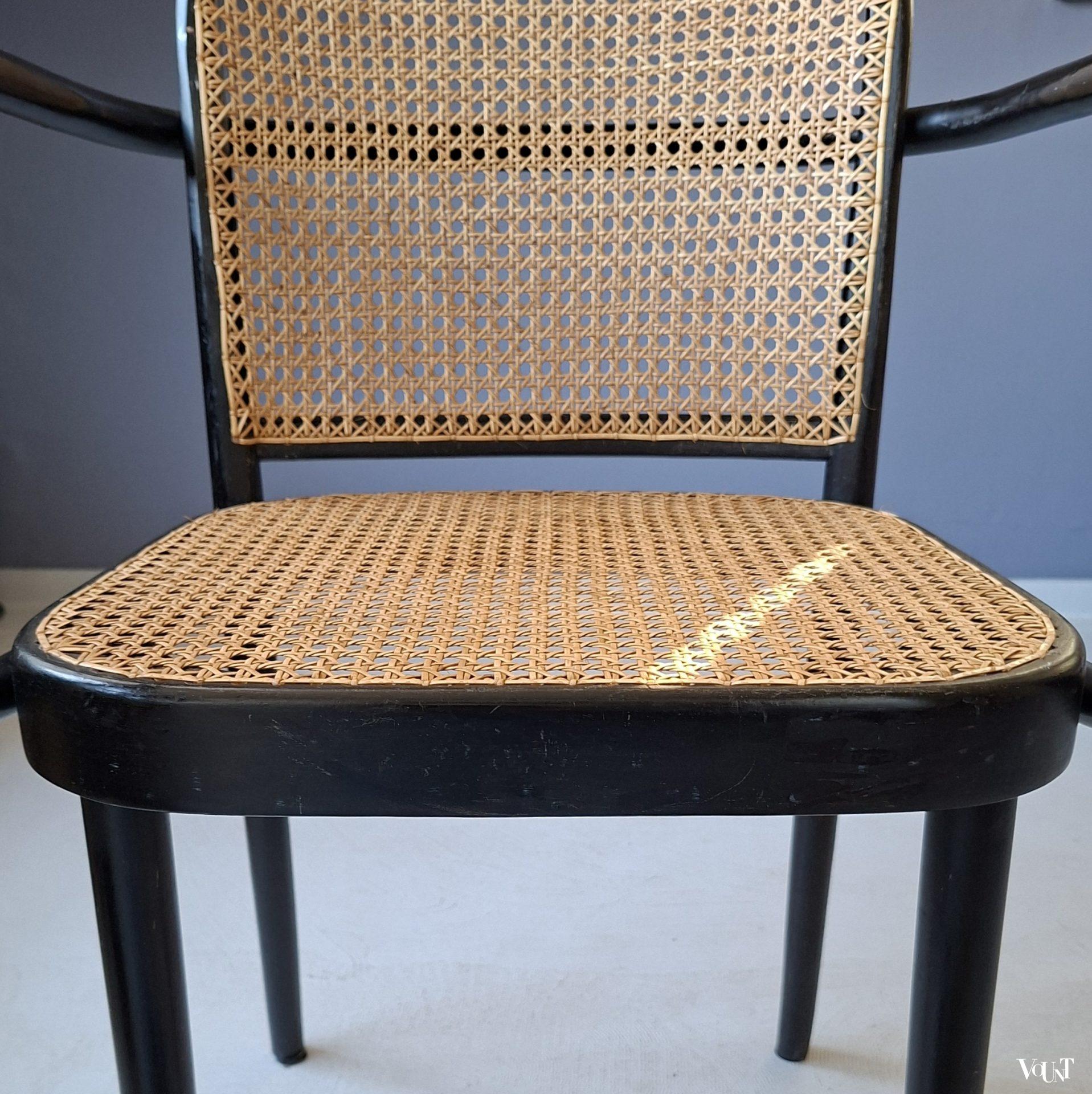 Het ontwerp van deze Praag of 811 stoel is van de Oostenrijker Josef Hoffmann, die de stoel in de jaren ’20 heeft ontworpen voor Thonet. Tijdloos design: de stoel was zowel in de jaren ’30 als in de jaren ’50/’60 populair (onder anderen onder architecten), en is ook nu weer erg gewild. Deze stoel is jaren ’70 geproduceerd door Ligna (voormalige na W.O. II genationaliseerde Thonet-fabriek in Tsjecho-Slowakije – nu Tsjechië -). Nieuwe met de hand geweven rotan zitting en rugleuning. Normale ouderdoms-/gebruikssporen. Gemerkt.