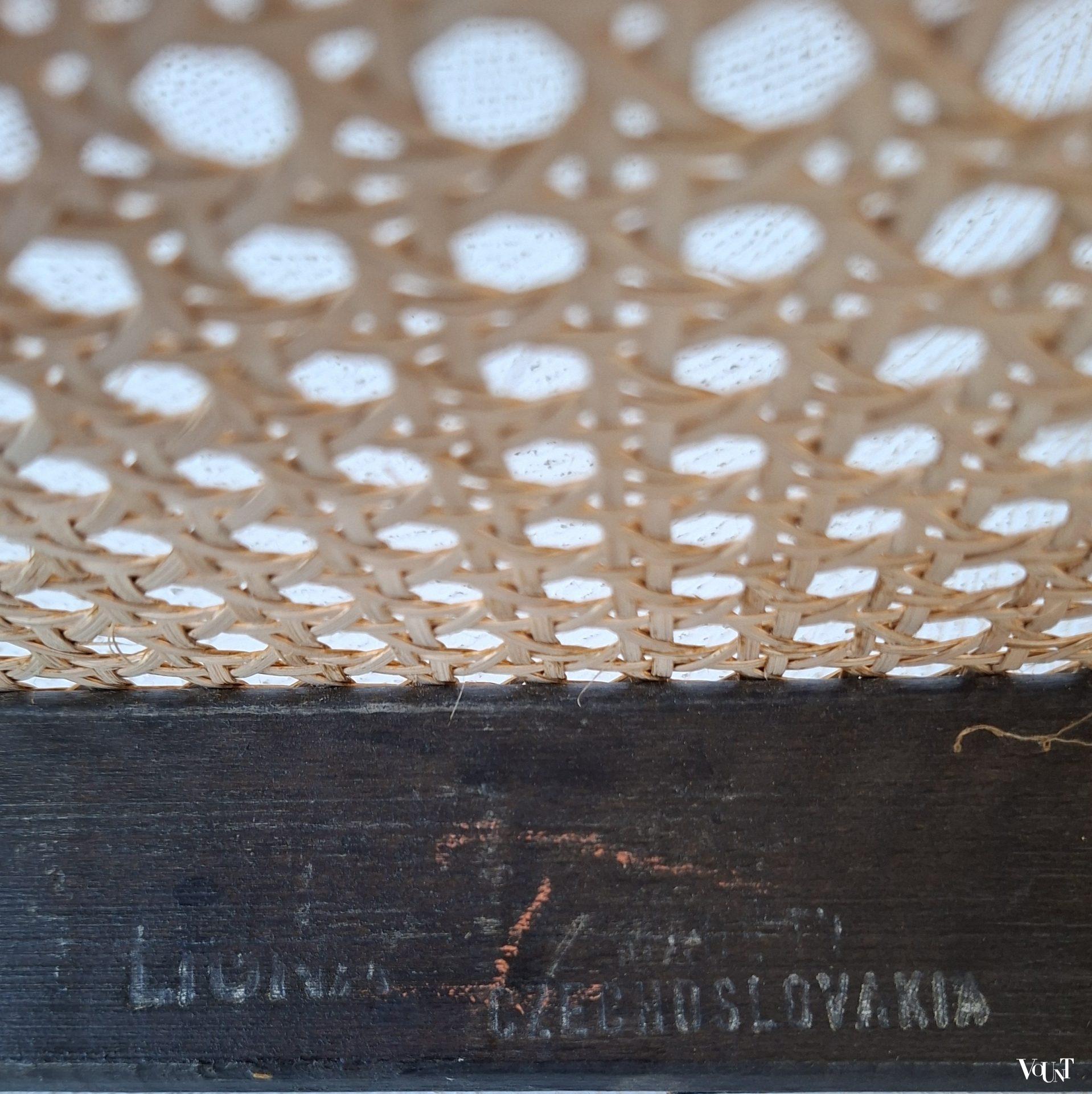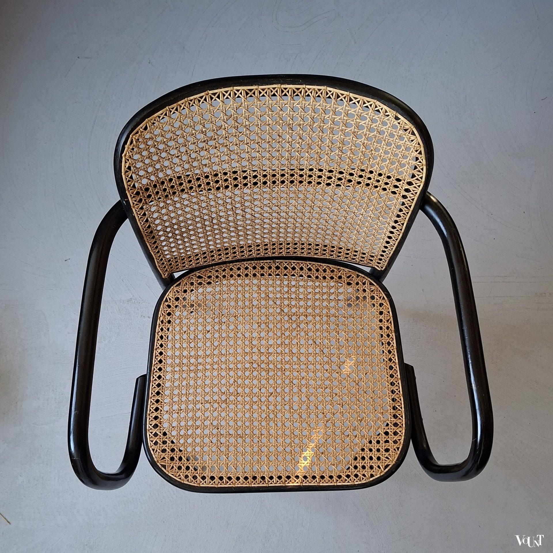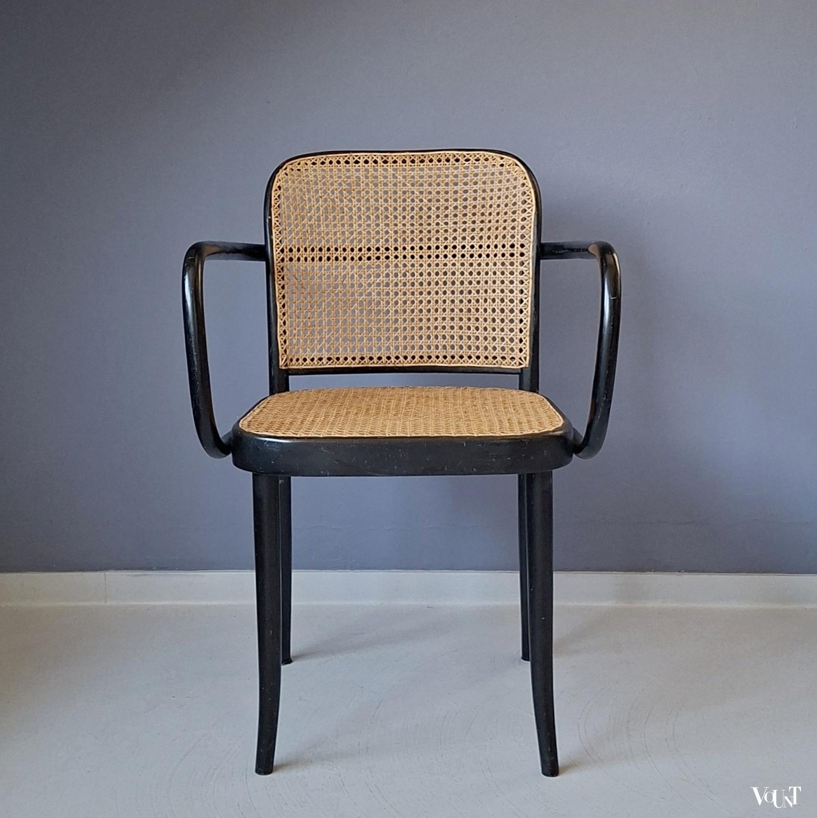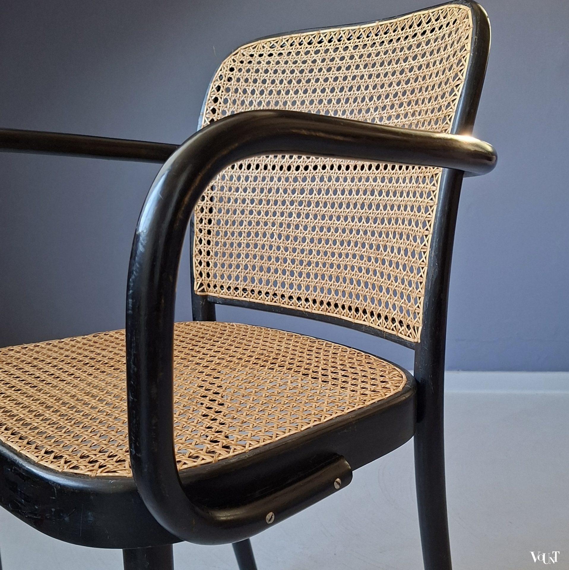 Het ontwerp van deze Praag of 811 stoel is van de Oostenrijker Josef Hoffmann, die de stoel in de jaren ’20 heeft ontworpen voor Thonet. Tijdloos design: de stoel was zowel in de jaren ’30 als in de jaren ’50/’60 populair (onder anderen onder architecten), en is ook nu weer erg gewild. Deze stoel is jaren ’70 geproduceerd door Ligna (voormalige na W.O. II genationaliseerde Thonet-fabriek in Tsjecho-Slowakije – nu Tsjechië -). Nieuwe met de hand geweven rotan zitting en rugleuning. Normale ouderdoms-/gebruikssporen. Gemerkt.