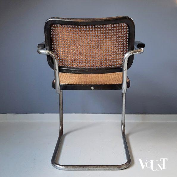 Stoel S64 (de versie met armleuningen) werd in 1928 ontworpen door de Hongaarse designer Marcel Breuer (1902 – 1981) en in 1929 door Thonet in productie genomen. Een tijdloos model. De stoel bestaat uit een metalen buisframe, houten armleggers en een houten zitting en rugleuning gecombineerd met een geweven mat van rotan (Wiener Geflecht). Deze stoel heeft nog een met de hand op het houten frame geweven zitting en rugleuning. Tegenwoordig zijn dit voorgefabriceerde matten. Deze stoel dateert uit de jaren ’30/’40 (productieperiode vast te stellen op basis van het metalen merkplaatje). Hout en metalen buisframe zijn in originele conditie en vertonen ouderdoms- en gebruikssporen. De stoel heeft een nieuwe met de hand geweven rotan zitting. Het rotan van de rugleuning is in goede conditie. Gemerkt met metalen merkplaatje uit de jaren ’30/’40.
